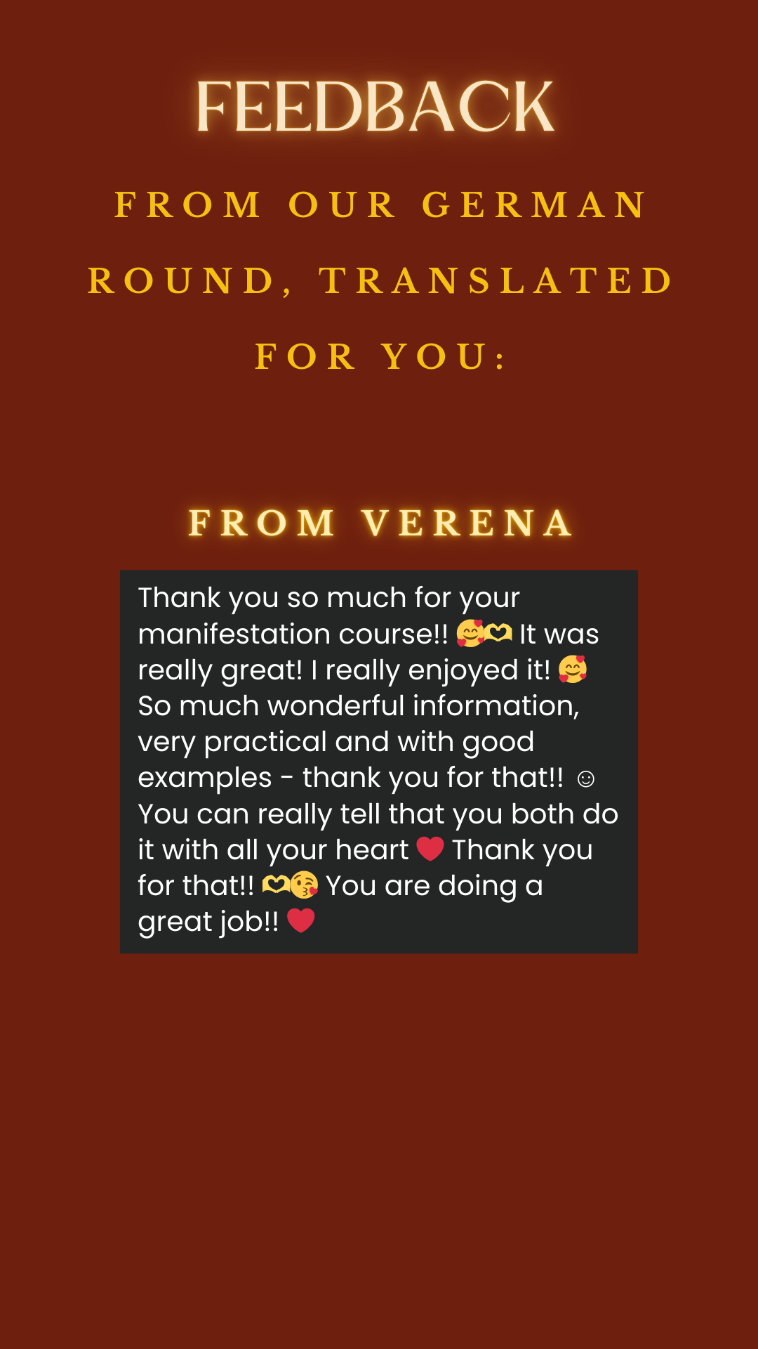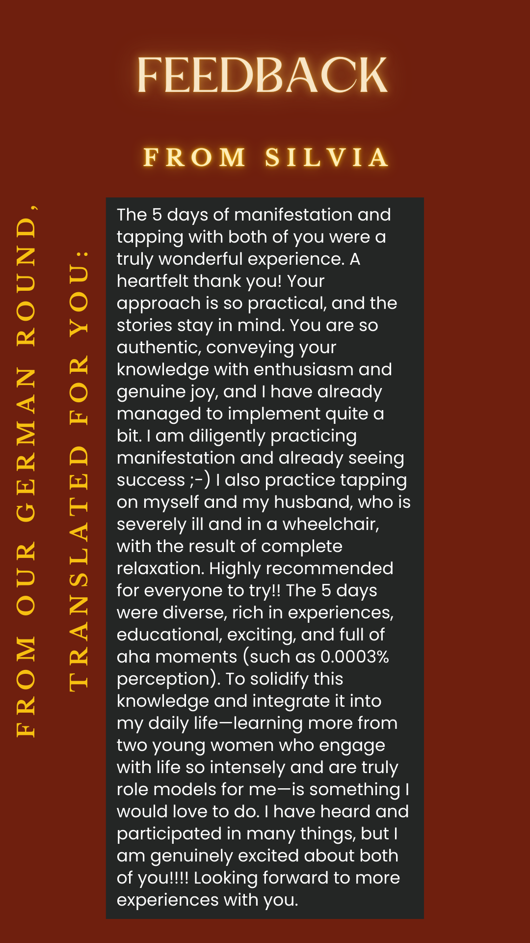 If you are ready to manifest a fulfilled and happy life and make your deepest wishes come true, then our manifestation course is perfect for you. My sister Julia and I will show you how to consciously manifest and provide you with special tools to support your manifestation process.